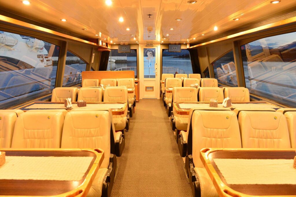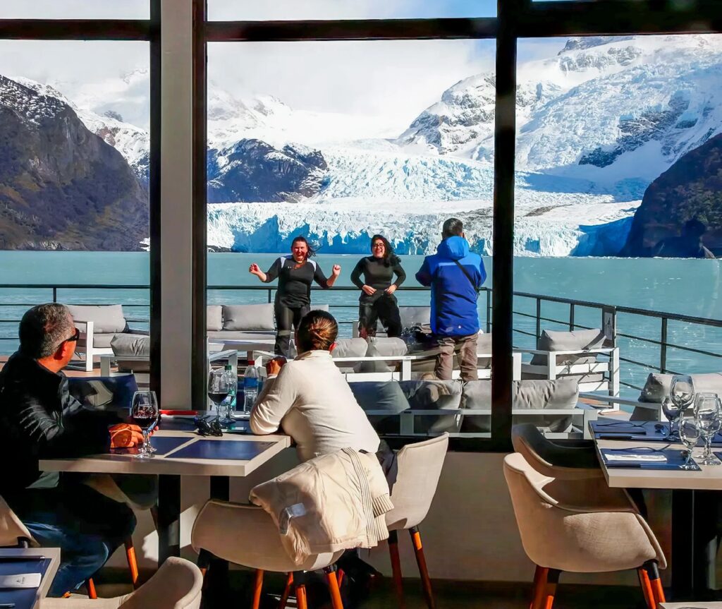 Você também terá serviço exclusivo de comidas e bebidas não alcoólicas durante toda a sua experiência. Poderá até mesmo desfrutar de bebidas alcoólicas em momentos especiais da sua aventura. E ao desembarcar na Base Spegazzini, um menu espetacular com iguarias regionais inesquecíveis da Patagônia o aguarda.