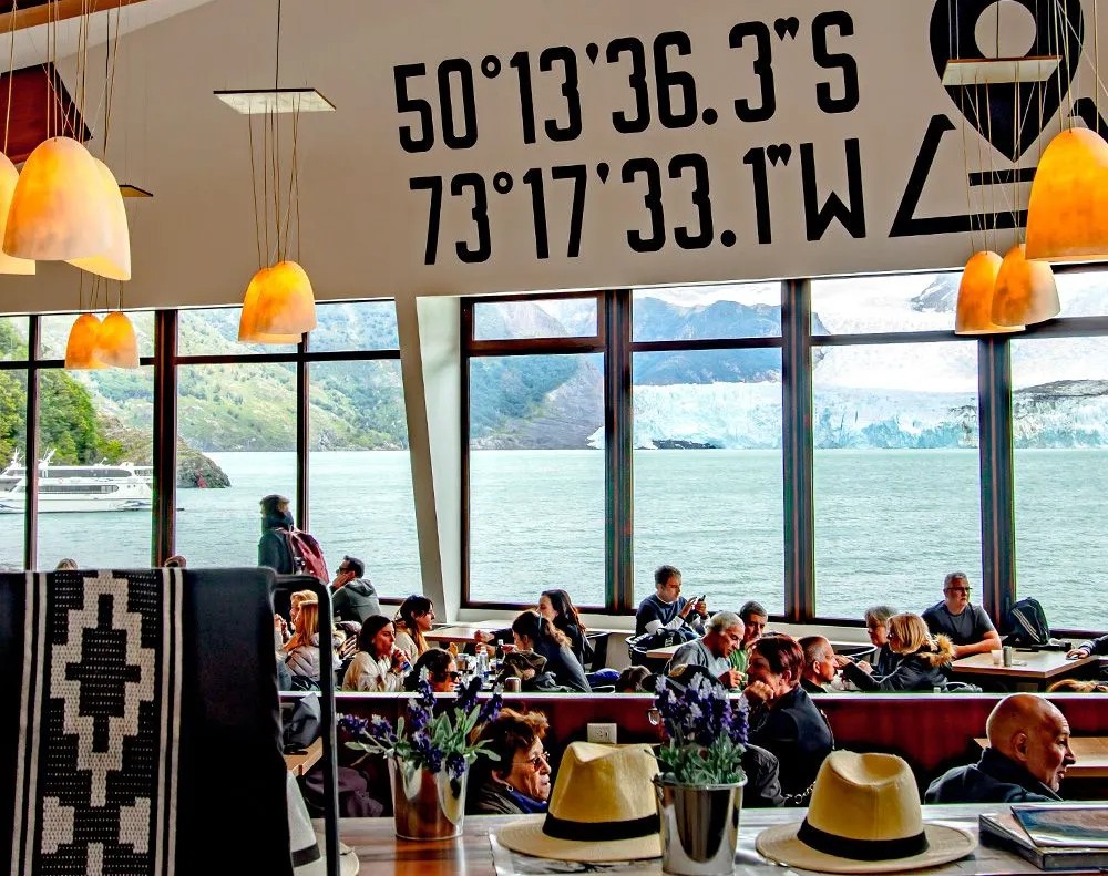 Lá dentro tem uma mini conveniência, uma loja de souvernis, livros e um restaurante com uma vista única para o Glaciar. É nessa hora que é servido o almoço que é vendido como opcional.